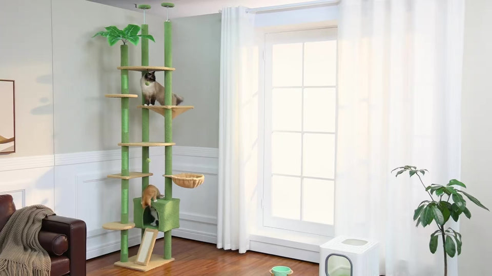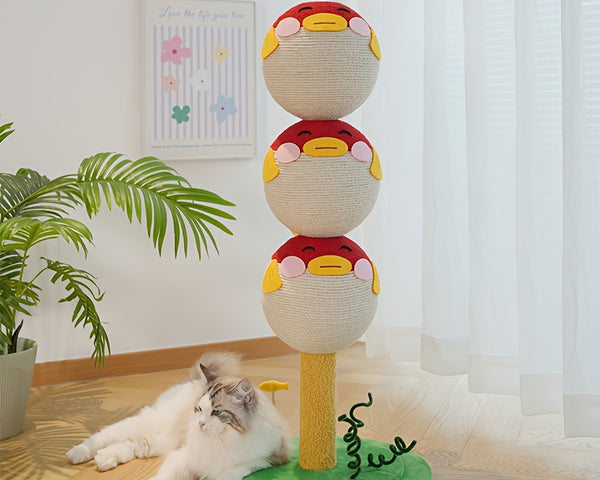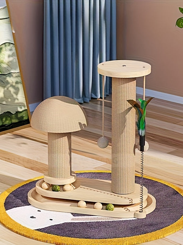 This solid wood rotating cat scratching post combines a teaser stick and sword grass surface—durable, interactive, and perfect for feline claw care. The climbing frame design encourages play and exercise, while the rotating feature adds fun, keeping cats entertained and protecting furniture from scratches.